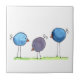 Fun watercolor painting of three whimsical birds in blue and purple with long skinny legs standing on green grass.