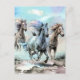 These mustangs are part of the herds still running wild across the American west. Here three horses gallop energetically through a dusty landscape, their manes flowing in the wind. The background features soft hues of blue and green, suggesting an open, expansive environment.This watercolour painting was initiated with an AI program, then reworked, recoloured and detailed.