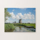 Jigsaw puzzle of three windmills along a canal with boats and reeds under a blue sky with puffy clouds creating a peaceful scene in the dutch countryside of Leidschendam, the Netherlands.
