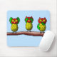 Three wise owls hear no evil, see no evil, speak no evil pixel art design mouse pad. These cute owls on a branch will look good on any desk.