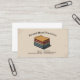 A cream color background vintage-style business card for a thrift store or business featuring a stack of neatly folded, textiles, with visible stitching details, in warm mustard yellow and faded denim blue and red. Perfect for a second-hand or used clothes shop or business.