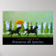 Second version, this one has the silhouette of a rider with the first horse. "Run with us through the wild" the first line reads. "Preserve All Species" the second line reads. Choose your size or customize this colorful poster with your own text! The silhouettes of two horses galloping through a green meadow, with pine trees, mountains and a sunset / sunrise. Textural background. From a mixed media art illustration by Minerva Bloom for Angela Piraino: www.angelapiraino.weebly.com