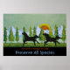 "Run with us through the wild" the first line reads. "Preserve All Species" the second line reads. Choose your size or customize this colorful poster with your own text! The silhouettes of two horses galloping through a green meadow, with pine trees, mountains and a sunset / sunrise. Textural background. From a mixed media art illustration by Minerva Bloom for Angela Piraino: www.angelapiraino.weebly.com