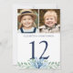 Watercolor blue floral wedding table number sign featuring two photos of the couple through the years for an entertaining table number sign. Fun to have similar age photos on the same sign and different photos on each table as guests mingle. Printed/Duplicated on both sides for two-sided viewing. PHOTO TIP: For fastest/best results, choose a photo with the subject in the middle and/or pre-crop it to a similar rectangle shape as shown BEFORE uploading and use the CHANGE tab next to the sample photo in the PERSONALIZE section to replace with your photo and it will fill the photo space perfectly. CHANGES: The black text color can be changed to coordinate with your color scheme and the greenery can be deleted if not desired. Contact the designer if you'd like this design modified or on another product to complement your wedding reception decor.