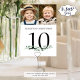 Decorate and identify your wedding reception tables with entertaining table number signs in 3.5x5 inches featuring 2 photos of the bride and groom (either together or individually, recent or through the years) and names in your choice of text font styles and color (shown in black. The design is duplicated on both sides for 2-sided viewing. Fun to have similar age photos through the years on the same sign and different photos on each table as guests mingle. CHANGES: The font styles and text colors can be changed to coordinate with your wedding colors and style and the greenery graphic can be deleted if not desired. ASSISTANCE: For help with design modification or personalization, color change, resizing, transferring the design to another product or if you would like coordinating items, contact the designer BEFORE ORDERING via the Zazzle Chat MESSAGE tab or email makeitaboutyoustore@gmail.com.