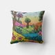 This is a vibrant and dynamic painting that portrays a lush, storybook-like landscape. The artwork features bold, black outlines that define every element, giving it a graphic novel aesthetic. Towering, sturdy trees with textured brown trunks dominate the scene; some bear bright green foliage, while others are adorned with rich purple leaves, suggesting a fantastical forest. The background unfolds with rolling hills depicted in distinct bands of vivid greens, oranges, and pinks, creating a layered and almost quilted appearance. A flowing blue body of water meanders through the midground, its surface reflecting a bright, almost iridescent quality. In the foreground, a profusion of oversized, stylized flowers in shades of pink, red, and yellow burst forth, accompanied by various green leafy plants and decorative swirls. The sky transitions from a soft blue to a warm yellow and orange at the horizon, with several small, black bird silhouettes soaring against it. The overall impression is one of joyful imagination and vibrant storytelling, rendered with an almost tactile, childlike artistic expression.