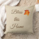 This throw pillow is shown in a beige neutral color with a Bless This Home text print with a pretty fall leaf accent.