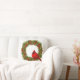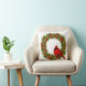 This throw accent pillow is shown in a festive holiday Christmas berry wreath and a red cardinal bird design.