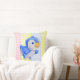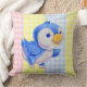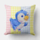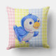 Throw pillow with cute blue bird on multi color gingham background.