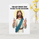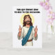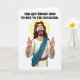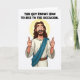 This card features a friendly, long-haired, bearded figure in a simple cartoon style, smiling wide with raised eyebrows as he gives two enthusiastic thumbs-up, like he’s cheering on someone he cares about. He wears a cream tunic with a teal sash draped across his chest, adding a bright accent against the mostly light palette. A soft, pale yellow halo circles his head, hinting at something special without tying him to any specific identity. The open-mouthed grin and wide eyes read like warm approval shared between close friends, the kind that makes you feel seen and supported. Centered above the figure, the message “THIS GUY KNOWS HOW TO RISE TO THE OCCASION.” appears in black, all-cap letters. The layout keeps the text at the top and the character below, leaving plenty of white space for a crisp, airy look, with a small nod to the season through 🌷🐰. The background is pure white, making the teal sash, yellow halo, and black lettering stand out sharply.