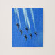 Thunderbirds roar across a bright blue sky, in classic flight. Excellent challenging puzzle!