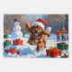 A cheerful Tibetan Spaniel runs playfully through the snowy winter scene, wearing a festive red Christmas hat. This charming design highlights the breed’s silky coat, expressive face, and lively spirit while capturing the warmth and joy of the holiday season. A heartwarming winter moment full of festive cheer.