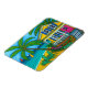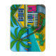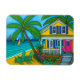 A painting by Lisa Lorenz of a vibrant, blissful tropical scene of a colorful cozy beach house along a turquoise seashore beach. Now available on a magnet.