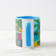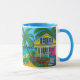 A painting by Lisa Lorenz of a vibrant, blissful tropical scene of a colorful cozy beach house along a turquoise seashore beach. Now available on a Mug. Enjoy a beautiful scene enjoying your favorite brew!