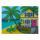 A painting print by Lisa Lorenz of a vibrant, blissful tropical scene of a colorful cozy beach house along a turquoise seashore beach.