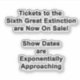 A STICKER with the words "Tickets to the Sixth Great Extinction are Now On Sale! Show Dates are Exponentially Approaching" printed in black letters on the front. This is to promote awareness about the detrimental effect climate change has on all living things.