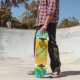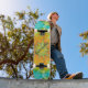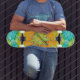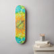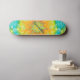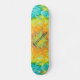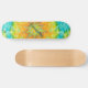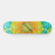 Dd brand skateboard, done in a retro tie dye look, in yellow, orange, teal, pink and green. Personalize the teal colored text field to suit your needs.
