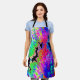 This apron features a tie dye inspired fractal art design with pink, purple, blue, black, green, aqua, and red colors.