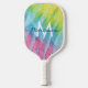 Personalized Custom Printed Monogrammed Pickleball Paddle with pink, teal, green, and yellow tie dye pattern and casual handwriting script calligraphy font.