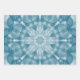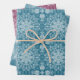 3 sheets of wrapping paper with different tie dye style design in the colors teal and magenta.