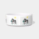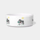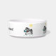 A White Medium Ceramic Pet Bowl, with the option to customize = " Your Dog's name here! with drawings of a Cartoon dog, Tiffany and her Frisbee, = 4 times around the bowl, = (Art by P.J.M.).