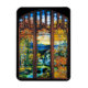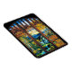 Tiffany stained glass window featuring a fall autumn landscape with a waterfall and autumn leaves.