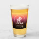 Celebrate the Chinese new year with this stylish pint glass, which features the Chinese letterform for the Tiger, the third sign/animal in the Eastern zodiac, and traditional celebratory Chinese greetings, rendered on a gold-to-red gradient background.