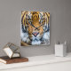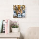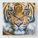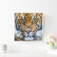 Wall clock featuring a close up portrait of a tiger's face, where the tiger is looking directly at you and his orange and black striped markings are shown in great vibrancy and detail. Great wall decor for animal and wildlife lovers. Photo taken in San Diego, California.