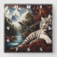A Bengal tiger lounges by a clear blue river surrounded by lush greenery and majestic mountains, showcasing its striking appearance in a serene setting.