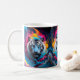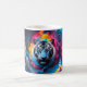 The tiger is primarily depicted in shades of blue, with intricate patterns and glowing elements adorning its fur, particularly around its face and body. The background features an ornate, symmetrical design with celestial motifs, including crescent moons, stars, and swirling patterns. The overall effect is one of otherworldly beauty, blending elements of nature and fantasy seamlessly. The tiger's intense gaze and regal posture contribute to the sense of power and mystery emanating from the artwork.