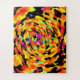 This bold abstract is swirling with tiger colors of orange, yellow and black with hints of lime green, pink and turquoise.