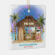 Tropical Christmas ornament features Santa enjoying a vacation at a Tiki bar on the beach under the moon and stars with palm trees, string lights and Hawaiian "Aloha" and "Mele Kalikimaka" greetings. Tropical cocktails, a pineapple, hibiscus and palm leaves, a surfboard and a parrot in a pirate hat decorate the bar area. Personalize it for a fun, one of a kind gift or to add some island charm to your own tree. Art by KL Stock