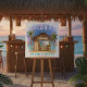 Tiki theme welcome sign features a watercolor Tiki bar on the beach under the moon and stars with palm trees, string lights, Tiki torches and "Aloha" and "Welcome To Paradise" greetings. Tropical cocktails, a pineapple, hibiscus and palm leaves, a surfboard and a parrot in a pirate hat decorate the bar area.. Perfect for beach, Tiki and luau themed couples shower, wedding reception, engagement party and anniversary celebrations. Art by KL Stock