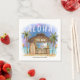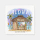 Tiki theme baby shower napkins feature a watercolor tiki bar on the beach under the moon and stars with palm trees, string lights, tiki torches and a Hawaiian "Aloha" greeting. Tropical cocktails, pineapple, hibiscus and palm leaves, surfboard and a parrot in a pirate hat decorate the bar area. Perfect for couples baby shower (or you can personalize it with just the name of the mother-to-be) Art by KL Stock