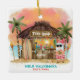 Tropical Christmas ornament features Santa enjoying a vacation at a Tiki bar on the beach at sunset with palm trees, string lights and Hawaiian "Aloha" and "Mele Kalikimaka" greetings. Tropical cocktails, a pineapple, hibiscus and palm leaves, a surfboard and a parrot in a pirate hat decorate the bar area. Personalize it for a fun, one of a kind gift or to add some island charm to your own tree. Art by KL Stock