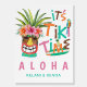 Tropical Tiki theme foam board sign features a hand painted Tiki totem, pineapple, surfboard and parrot with "It's Tiki Time" typography. The "aloha" greeting and names (or whatever text you like that can fit in that space!) can be personalized. Perfect for a wedding reception, couples shower, luau, birthday, anniversary and any island themed celebrations. Art by KL Stock