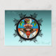 I drew this by hand with prismacolor pencil and micron ink. Tiki frog the warrior is a profile portrait with smiling tiki masks in center, overhanging palm branches and living wave faces at bottom. A sunset horizon and bamboo center border with antenna alien man below and silhouette palms on outer circle border.