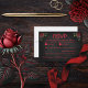 This unique Gothic style wedding RSVP is striking and bold, with a black smoky background that exudes an air of mystery and sophisticated elegance. The text, which is totally customizable in every way, is shown in matching red. This RSVP coordinates with the other pieces in our Til Death Do Us Part Gothic Collection.