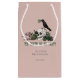 These elegant Til Death Do Us Party Irish skull bridesmaid gift bags feature hand-drawn Irish & gothic themed illustrations in black ink, showcasing a skull and a black crow adorned with green roses, leaves, berries, wildflowers and green clovers. Elegant goth blush pink background. All text is editable.