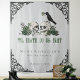 This elegant gothic "Til Death Do Us Part" Irish bridal shower party décor backdrop features hand-drawn Irish & gothic themed illustrations in black ink, showcasing 2 skulls and a black crow adorned with green roses, leaves, berries, wildflowers and green clovers. Elegant soft gray background. All text is editable.