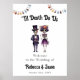 Wedding welcome sign featuring elegantly dressed skeletons.