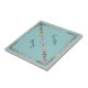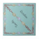 Three glass beads (two yellow-green beads to either side of a blue bead with painted flower) on copper chain is replicated to four sides of the tile with an additional image place diagonally. To either side of the diagonal, you may personalize with names of your choice.