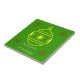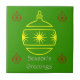 Holiday ornaments (round, ball shaped, with central band of stars) adorn this "greeting tile". Large central ornament is yellow with small red ornaments in the four corners. "Season's Greetings" is at bottom.