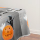 This Halloween-themed tablecloth features a fully tiled layout of a spooky seasonal design. Each tile showcases a large orange pumpkin, a white ghost outlined in blue, a creepy tree with branch-like arms, flying bats, and a glowing light blue moon — all set against a soft gray background. The repeating pattern creates a festive and eerie atmosphere, perfect for Halloween parties, haunted house décor, or fall-themed gatherings. With no text overlay, the design maintains a clean, seamless look that works beautifully across the entire surface.