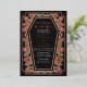 Make a bold statement of eternal love. This gothic wedding invitation features ‘Till Death Do Us Part’ in a coffin-shaped frame, adorned with thorns, roses, and rose gold accents against a black background. Perfect for a hauntingly romantic celebration! Personalize the text, font, and background color to suit your design preferences. Matching Items in our shop for a complete party theme. Please note that the rose gold on the BACK of the invitation is NOT real foil and is printed in flat colors.