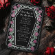 Make a bold statement of eternal love. This gothic wedding invitation features ‘Till Death Do Us Part’ in a coffin-shaped frame, adorned with thorns, roses, and silver accents against a black background. Perfect for a hauntingly romantic celebration! Personalize the text, font, and background color to suit your design preferences. Matching Items in our shop for a complete party theme. Please note that the silver on the BACK of the invitation is NOT real foil and is printed in flat colors.