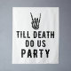 Till death do us party backdrop for a bridal shower. Party decor with a skeleton hand in black and white for a Gothic, heavy metal, or rocker party. Sign to hang on a wall, arch, or photo stand as decorations for the event.