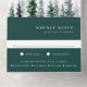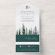 Elegant fall or winter wedding invitation features a copse of tall watercolor pine trees in shades of grayed sage and hunter green. Personalize with your wedding details in chic soft off-black lettering, topped by your initials joined by a script ampersand to create a beautiful custom monogram. A chic choice for elegant autumn or winter weddings in mountain or forest settings.