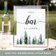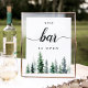 Invite guests to grab a favorite libation from the bar with our charming rustic wedding bar sign. 11x14 poster features a bottom border of watercolor pine trees in rich shades of hunter and forest green, with "the bar is open" in off-black calligraphy script and block lettering. Designed to match our Timber Grove collection for autumn or winter weddings in forest or woodland settings.