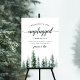 Planning an unplugged ceremony but not sure what wording to use to let your wedding guests know to put away their phones? This chic sign takes care of it for you in style. Rustic elegant design features "welcome to our unplugged ceremony" in calligraphy and block typefaces with your names and custom message beneath. Shown with "please put away your phones and cameras until after the ceremony." Adorned with a row of winter watercolor pine trees in forest green; a perfect match for our Timber Grove wedding stationery collection.